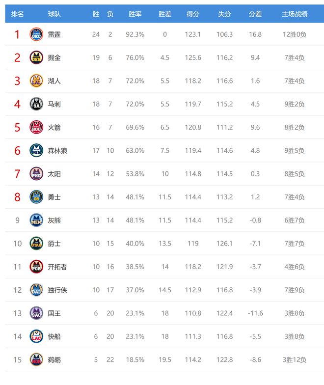 今日比赛后西部排名没有变动,具体排名如下: