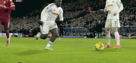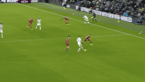 下半场开始后,场上风云突变,第48分钟,利兹联后卫罗登的横传,变成了乌龙助攻,埃基蒂克抢断后冷静晃开阿姆帕杜,打破僵局。